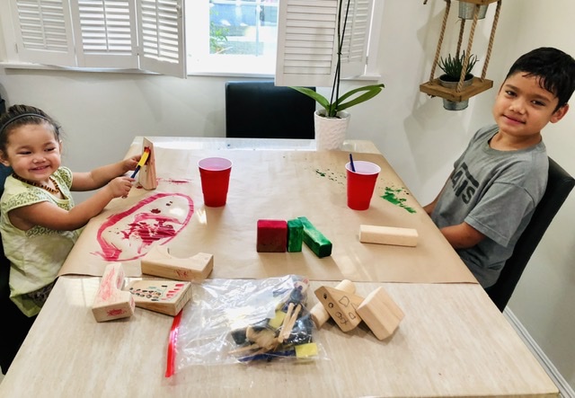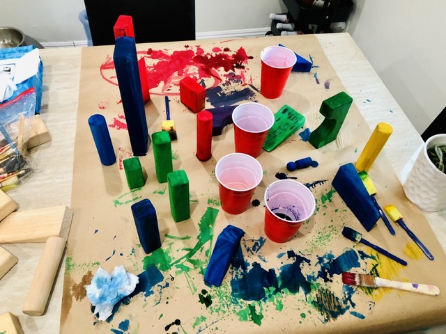 We took them home and searched online ways to dye wooden blocks. I decided the easiest way for the kids to do it themselves and make an activity out of it was to paint them. We wiped each block down with disinfectant wipes and went to town with painting them with watercolor paint. We waited 24 hours for them to dry, some dried faster than others and some needed more coats because of the scribbles on them.